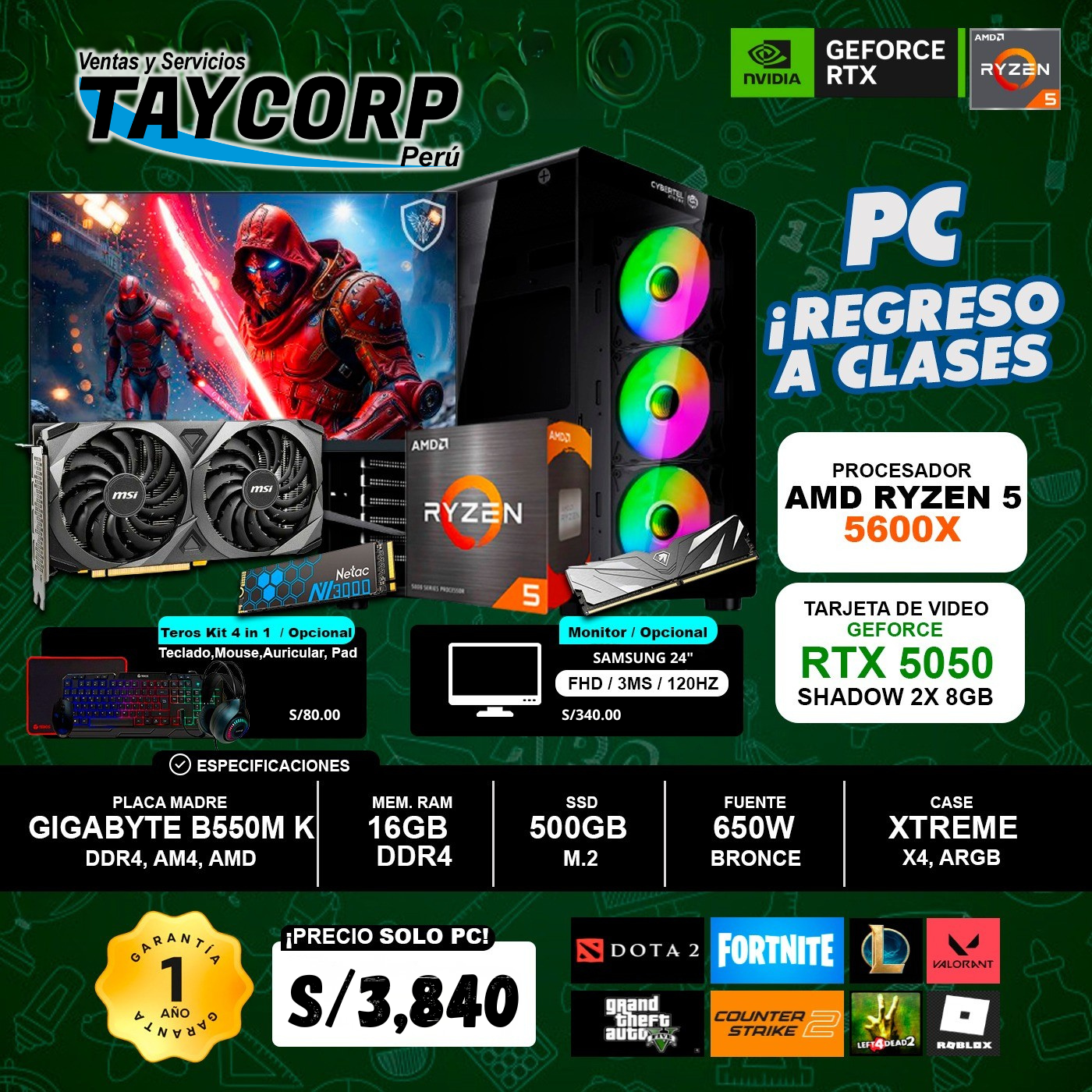 CAMD Ryzen 5 5600x, 16GB DDR4, SSD 500GB M2, RTX 5050 8GB, Fuente 650W Reales, Case Gamer.