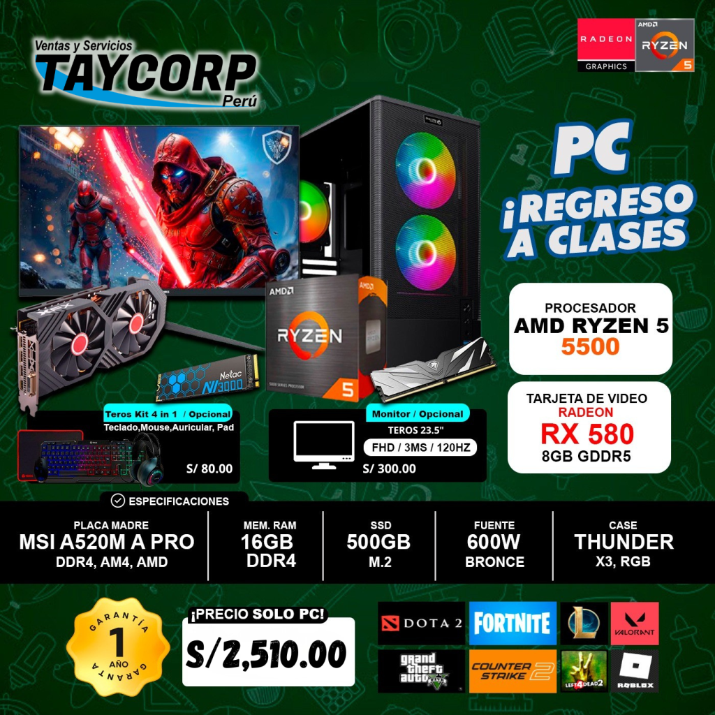 AMD Ryzen 5 5500, 16GB RAM DDR4, SSD 500GB M2, 600W Reales, RX 580 8GB GDDR5, Case Gamer RGB