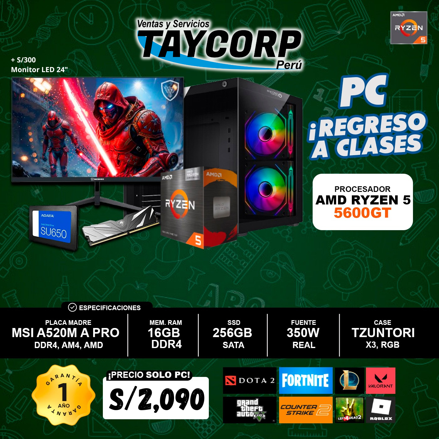 AMD Ryzen 5 5600GT, 8GB de RAM DDR4, SSD 250GB SATA, 350W REALES, Case con RGB.